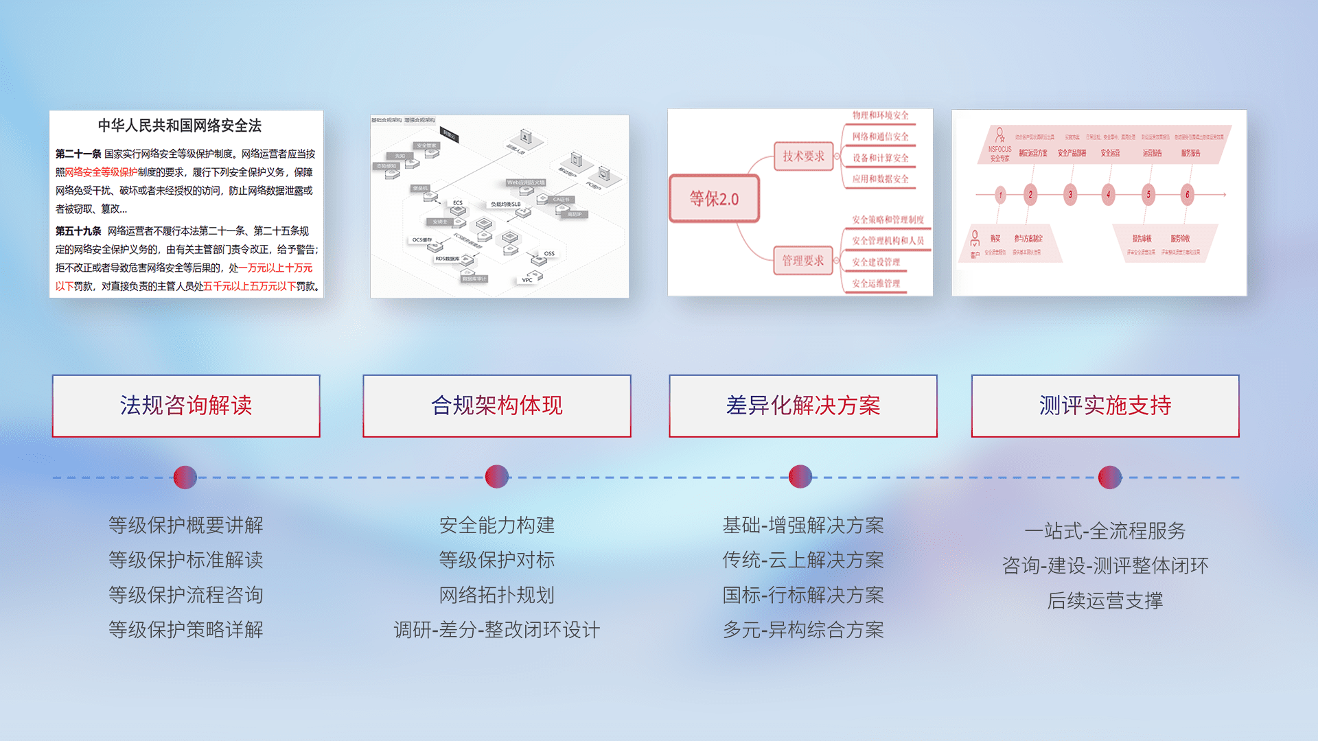通过专业的法律咨询解读、、、、合规架构体现、、、差异化解决方案、、测试实施支持等服务,,,为客户量身打造等保合规体系。。